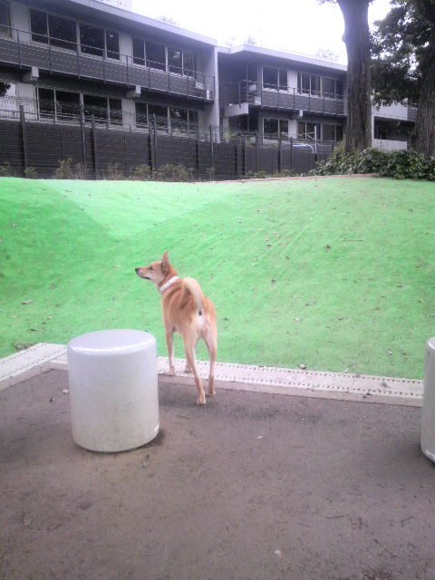 お犬、人工芝に佇む姿はさながら海岸で物思う人魚